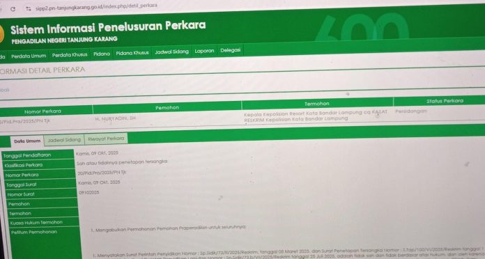 BANDARLAMPUNG – Sidang permohonan gugatan prapradilan dengan pemohon Pengusaha Raja Besi Tua, H. Nuryadin S.H., terhadap termohon Kapolres Kota Bandarlampung Cq Kasat Reskrim Polresta Bandarlampung masih terus digelar di Pengadilan Negeri (PN) Tanjungkarang. Sebagaimana dilansir dari website Sistem Informasi Penelusuran Perkara (SIPP) PN Tanjungkarang, agenda sidang telah memasuki tahap pembuktian surat dan saksi dari pemohon.