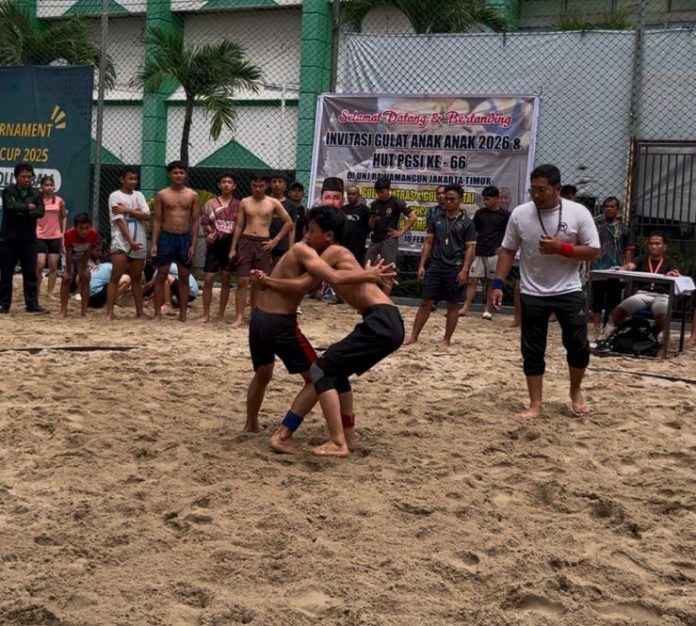 Emas kedua dipersembahkan oleh Rayyan Khalfani Farros di kelas 65 kilogram U-15 putra gulat pasir, dengan performa konsisten sepanjang kejuaraan.