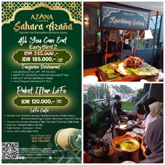Rayakan kebersamaan Ramadan dengan hidangan berlimpah, suasana elegan, dan pelayanan terbaik. Untuk informasi dan reservasi, dpt menghubungi 0822 8231 8187 atau 0812 1914 8997. Azana Boutique Hotel Lampung — destinasi terbaik untuk berbuka puasa yang lebih berkesan.