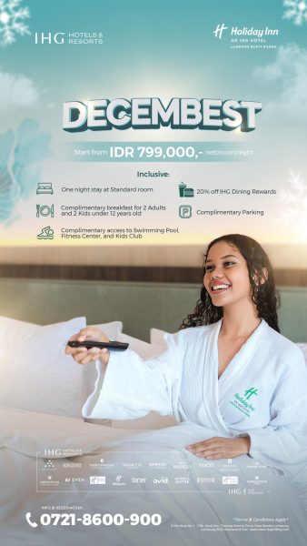 Promo “Decembest” ini tersedia untuk periode terbatas dan menjadi pilihan ideal bagi keluarga yang ingin menikmati suasana kota Bandar Lampung dari ketinggian Bukit Randu sambil merasakan pelayanan khas Holiday Inn.