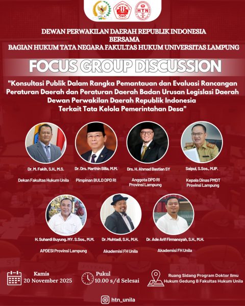 FGD bertajuk “Konsultasi Publik Dalam Rangka Pemantauan dan Evaluasi Rancangan Peraturan Daerah dan Peraturan Daerah Badan Urusan Legislasi Daerah Terkait Tata Kelola Pemerintahan Desa” itu akan digelar besok, Kamis (20/11/2025) di Ruang Sidang Program Doktor Ilmu Hukum Gedung B Fakultas Hukum Unila.