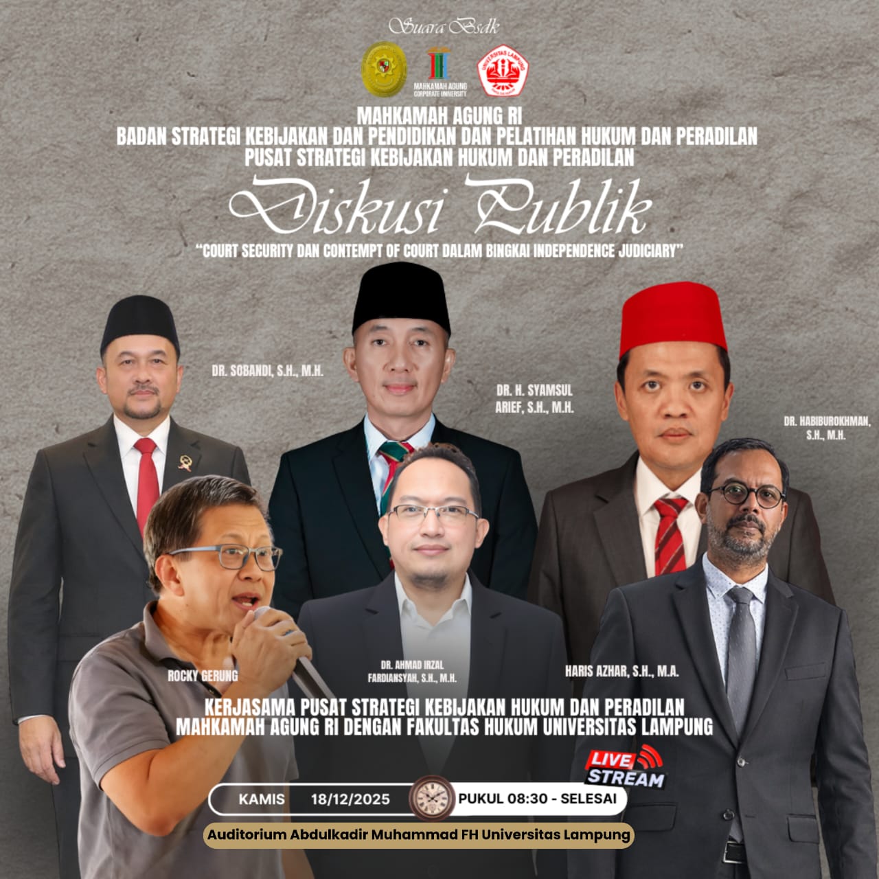 BANDAR LAMPUNG – Fakultas Hukum Universitas Lampung (FH-Unila), Kamis, 18 Desember 2025 mulai pukul 08.00 WIB, akan mengadakan diskusi publik bertema “Court Security dan Contempt Of Court dalam Bingkai Independence Judiciary”. Acara yang dipusatkan di Ruang Auditorium Abdulkadir Muhammad FH Unila ini, digagas dan bekerjasama dengan Pusat Strategi Kebijakan Hukum dan Peradilan Mahkamah Agung (MA) RI.