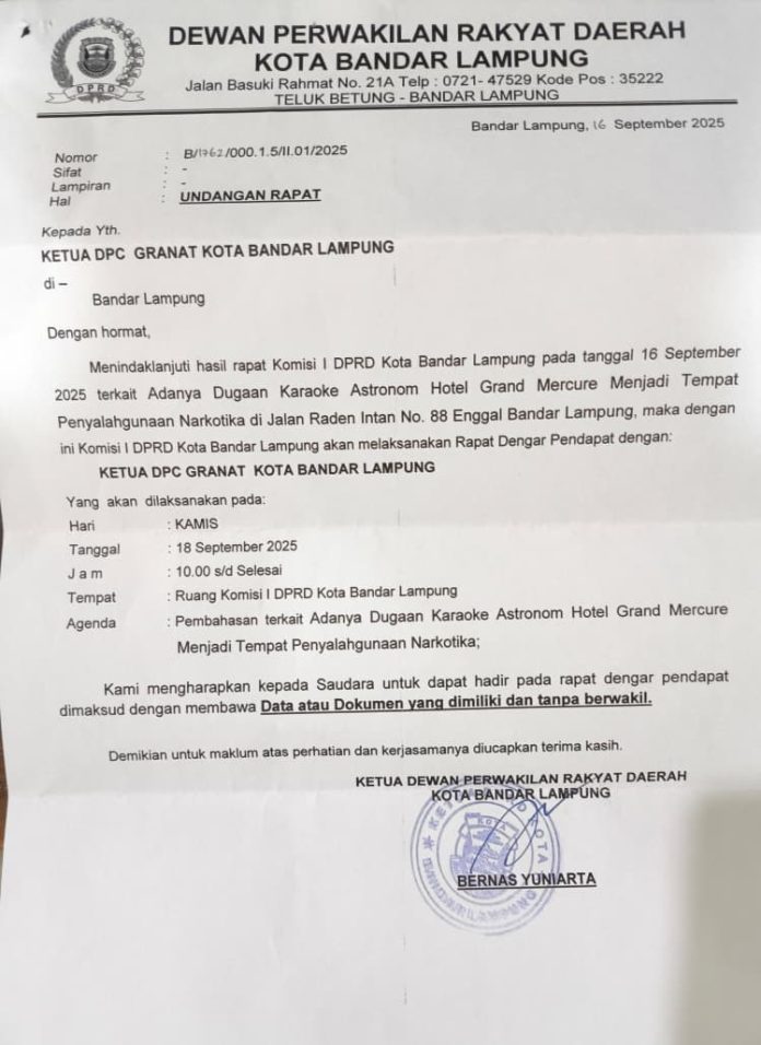 “Kami sudah menerima undangan hearing dari DPRD Kota Bandarlampung. Surat undangan ditandatangani langsung Ketua DPRD Bernas Yuniarta,” ujar Ketua DPC GRANAT Kota Bandarlampung, Gindha Ansori Wayka, S.H., M.H, Kamis, 18 September 2025.