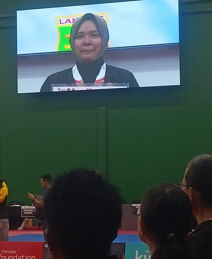 DENGAN bibir lebam karena pukulan lawan, air mata Vina Febriana Hasan nyaris tumpah saat lagu kebangsaan mengalun mengiringi prosesi pengalungan medali di GOR Kalimutu.Kudus, Minggu (19/10/2025) malam.
