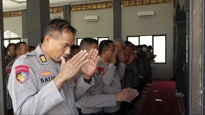 Di Masjid Markas Ditpolairud Polda Lampung, para personel berdiri dalam saf rapi sebelum memanjatkan doa.