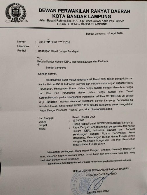 BANDARLAMPUNG – DPRD Kota Bandarlampung Kamis, 9 April 2026 menggelar Rapat Dengar Pendapat (RDP). Hal ini menyikapi adanya Pengaduan dari Kantor Hukum IDEAL Indonesia Lawyer dan Partners. Yakni Terkait dugaan Pidana Perumahan Arana Residence, membangun rumah di atas fungsi sungai dengan menimbun sungai dan Site Plan Perumahan masuk diatas fungsi sungai.