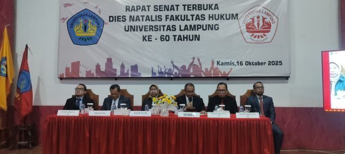 BANDARLAMPUNG – Fakultas Hukum (FH) Universitas Lampung (Unila) menggelar Rapat Senat Terbuka dalam rangka memperingati Dies Natalis ke-60, Kamis, 16 Oktober 2025. Acara ini berlangsung di Auditorium Prof. Abdulkadir Muhammad, S.H., Gedung A FH Unila.