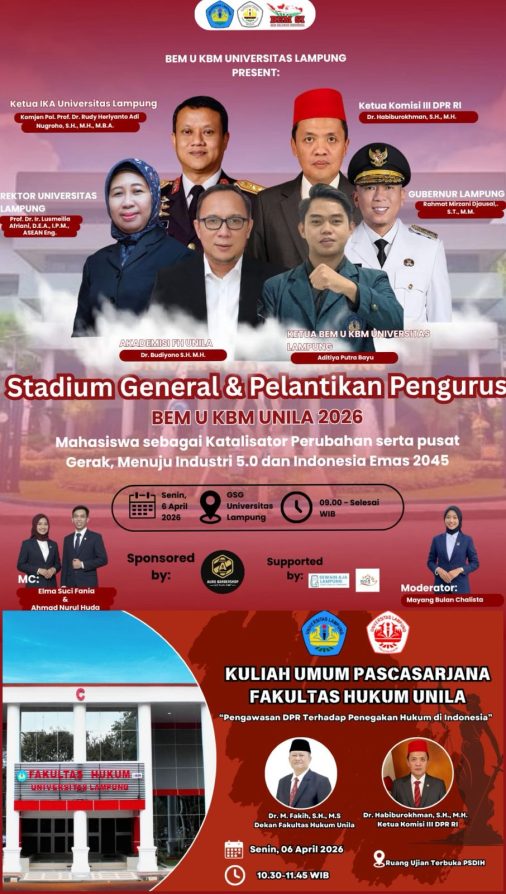 BANDARLAMPUNG– Ketua Komisi III DPR-RI, Dr. Habiburokhman, S.H., M.H., hari ini Senin, 6 April 2026 pukul 09.00 WIB direncanakan menghadiri acara Pelantikan Pengurus Badan Eksekutif Mahasiswa (BEM) di Gedung Serba Guna (GSG) Universitas Lampung (Unila). Pada kesempatan ini, Habiburokhman akan menjadi pembicara Stadium General bertema: “Mahasiswa sebagai Katalisator Perubahan serta Pusat Gerak Menuju Industri 5.0 dan Indonesia Emas 2045.
