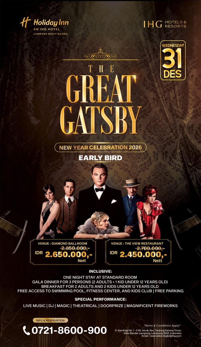 BANDAR LAMPUNG – Menyambut pergantian tahun menuju 2026, Holiday Inn Lampung Bukit Randu menghadirkan pengalaman malam tahun baru yang penuh kemewahan dan glamor dengan tema “The Great Gatsby”. Acara ini akan digelar pada Rabu, 31 Desember 2025, menawarkan suasana pesta klasik era 1920-an yang penuh gemerlap, elegan, dan penuh kejutan.