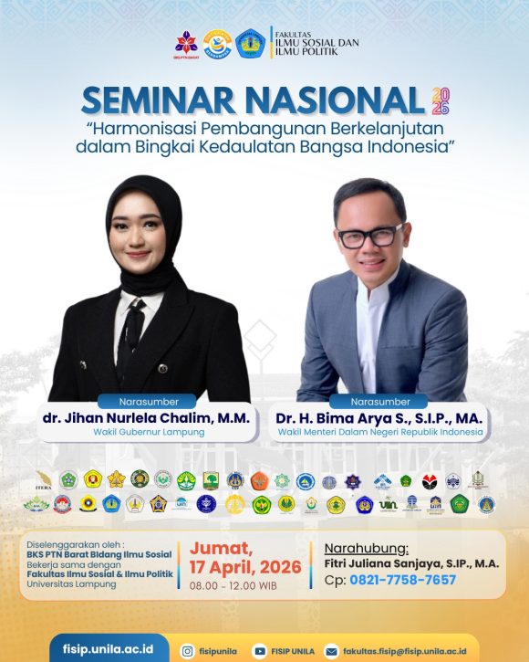 Sementara untuk Seminar Nasional (Semnas) mengambil tema “Harmonisasi Pembangunan Berkelanjutan dalam Bingkai Kedaulatan Bangsa Indonesia”. Adapun sebagai pembicara adalah Wakil Menteri Dalam Negeri (Wamendagri), Dr. H. Bima Arya Sugiarto, S.IP., MA dan Wakil Gubernur (Wagub) Lampung, Dr. Jihan Nurlela Chalim, M.M.