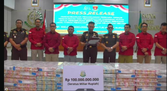 BANDARLAMPUNG – Tim Pidana Khusus Kejati Lampung, Rabu, 25 Februari 2026 menggelar konfrensi pers tentang penanganan kasus tindak pidana korupsi (tipikor) penggunaan dan pemanfaatan kawasan hutan untuk perkebunan di Provinsi Lampung. Selain itu, Kejati Lampung juga mengungkap dan memamerkan adanya setoran sebagian uang titipan pengganti kerugian negara sebesar Rp100 miliar.(red)