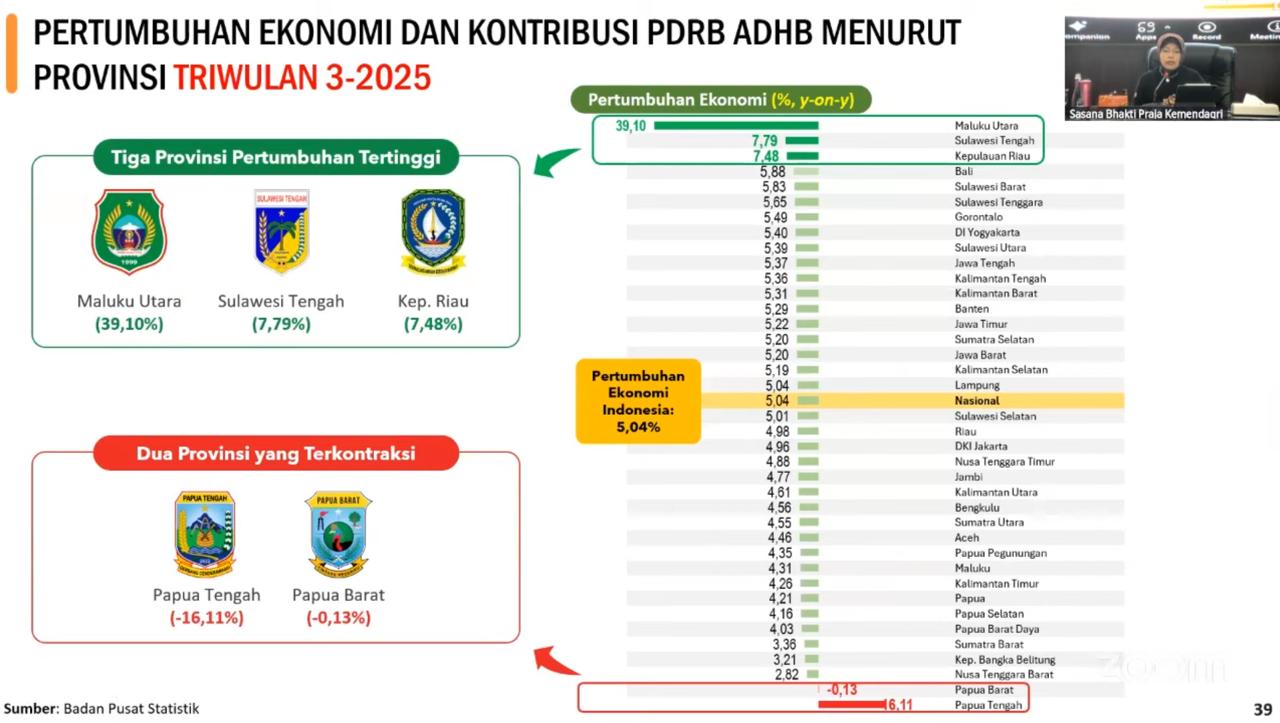Provinsi dengan pertumbuhan ekonomi tertinggi tercatat di Maluku Utara sebesar 39,10 persen, diikuti Sulawesi Tengah 7,79 persen, dan Kepulauan Riau 7,48 persen. Sementara dua provinsi mengalami kontraksi, yaitu Papua Tengah sebesar -16,11 persen dan Papua Barat -0,13 persen.