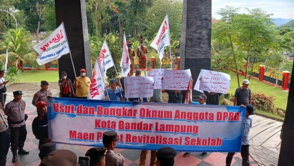 BANDARLAMPUNG – Puluhan massa yang tergabung dalam LSM Lembaga Pemantau Kebijakan Publik (Lapak) menggelar aksi unjuk rasa di depan Gedung DPRD Kota Bandar Lampung, Selasa (12/11/2025). Mereka menuntut lembaga hukum mengusut proyek revitalisasi sekolah dasar di Kota Tapis Berseri.