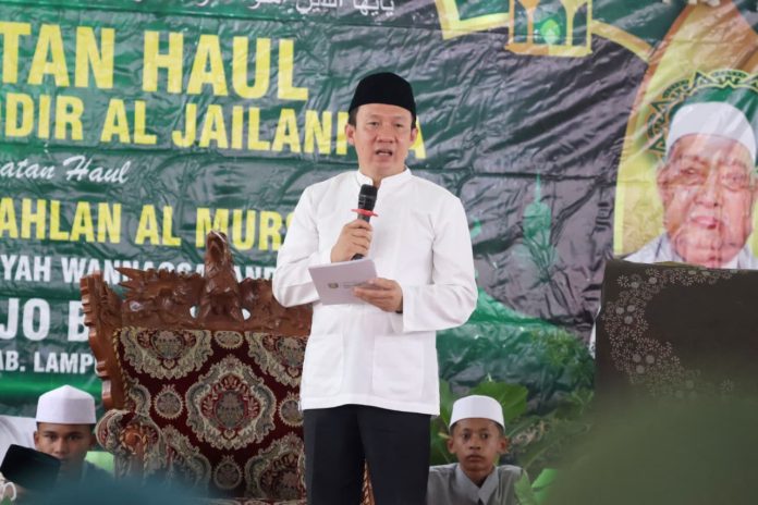 Lampung Tengah – Gubernur Lampung diwakili Sekretaris Daerah Provinsi Lampung, Marindo Kurniawan, menghadiri Pengajian Haul Syaikh Abdul Qodir Al-Jailani Thoriqoh Qodiriyah Wanaqsabandiyah, di Mushola Baiturrohman, Kampung Rejo Basuki V, Kecamatan Seputih Raman, Minggu (12/10/2025).