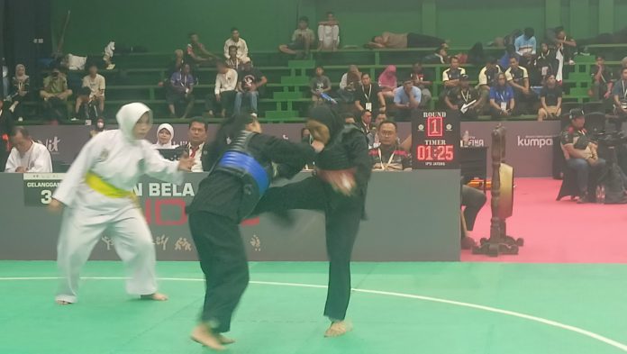 Bertanding di kelas A Putri, Riski Enjel mengalahkan pesilat asal Sulawesi Utara (Sulut) Karina Pongilatan di GOR Kaliputu