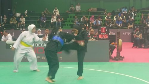 KUDUS – Pesilat putri Lampung Riski Enjel Pinata kembali unjuk gigi di PON Beladiri I Kudus.