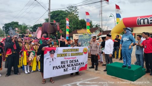 LAMPUNG TIMUR – Desa Pasar Sukadana tak sekadar merayakan usia. Pada peringatan Hari Ulang Tahun (HUT) ke-82, Minggu (14/12/2025), desa ini menjelma menjadi ruang terbuka ekspresi rakyat. Ribuan warga dari 14 dusun tumpah ke jalan dalam karnaval budaya yang sarat makna kebersamaan, identitas, dan kekuatan sosial.