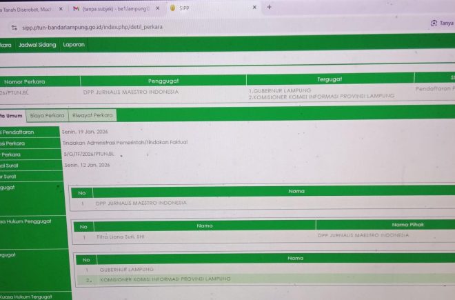 Demikian tercantum dalam Sistem Informasi Penelusuran Perkara (SIPP) PTUN Bandarlampung, Senin, 26 Januari 2026.(red)