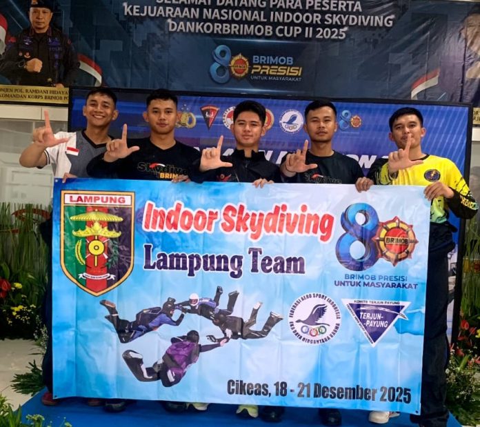 Para penerjun Lampung yang turun di Kejuaraan Nasional (Kejurnas) Indoor Skydiving Dankorbrimob Cup II 2025 di Wind Tunnel Korps Brimob, Cikeas Bogor, Jawa Barat pada 18-21 Desember 2025. Secara keseluruhan para penerjun Lampung meraih 3 medali, 1 Medali Emas, 1 Perak dan 1 Perunggu.