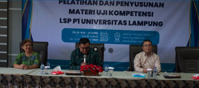 Bandarlampung: Universitas Lampung (Unila) menggelar pelatihan dan penyusunan materi uji kompetensi LSP LP-1 yang berlangsung di ruang sidang dua lantai empat, pada Rabu, 26 November 2025.