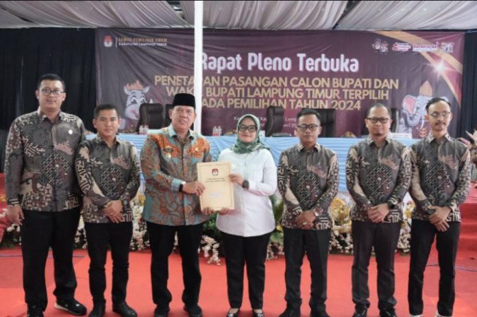 LAMPUNG TIMUR – Komisi Pemilihan Umum (KPU) Kabupaten Lampung Timur menggelar Rapat Pleno Terbuka untuk menetapkan pasangan Bupati dan Wakil Bupati Lampung Timur terpilih dalam Pemilihan Tahun 2024.