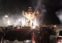 PESAWARAN - Perayaan malam pergantian tahun, masyarakat Pesawaran menembaki Patung Garuda Tugu Pengantin menggunakan petasan tepat pukul 00.00 WIB.