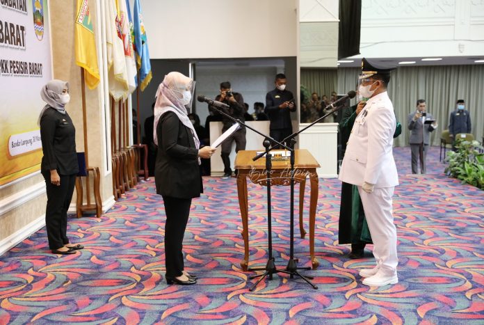BANDARLAMPUNG – Wakil Gubernur Lampung Chusnunia Chalim (Nunik) melantik dan mengambil sumpah jabatan penjabat (Pj) Bupati Pesisir Barat Bambang Sumbogo, di Lt. III Balai Keratun, Komplek Kantor Gubernur, Bandarlampung, Selasa (30/3/2021).